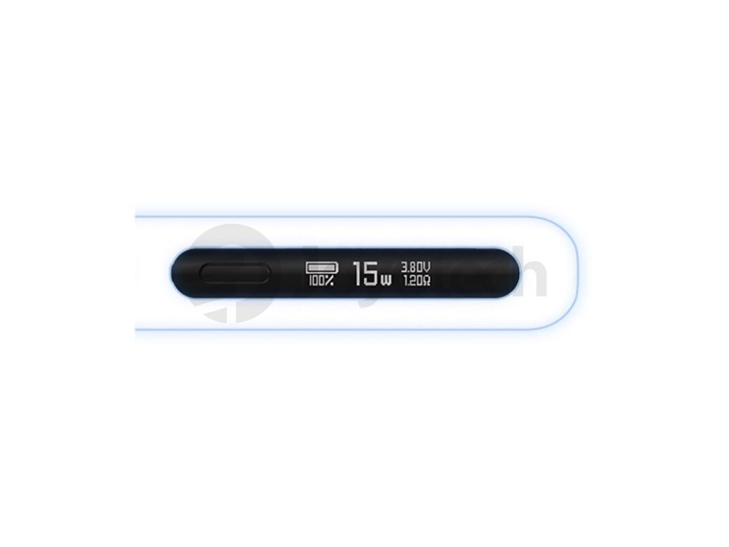 V boční části se nachází přehledný a jasný OLED displej se stručným a uživatelsky přívětivým rozhraním. Displej vás informuje o aktuálním stavu baterie, výstupním napětí, odporu cartridge a o nastaveném výkonu. Ten je možné regulovat v rozpětí 5 - 25 W. Výkon si navíc nastavíte pomocí jediného tlačítka, celkové nastavení je tak nesmírně rychlé a intuitivní.