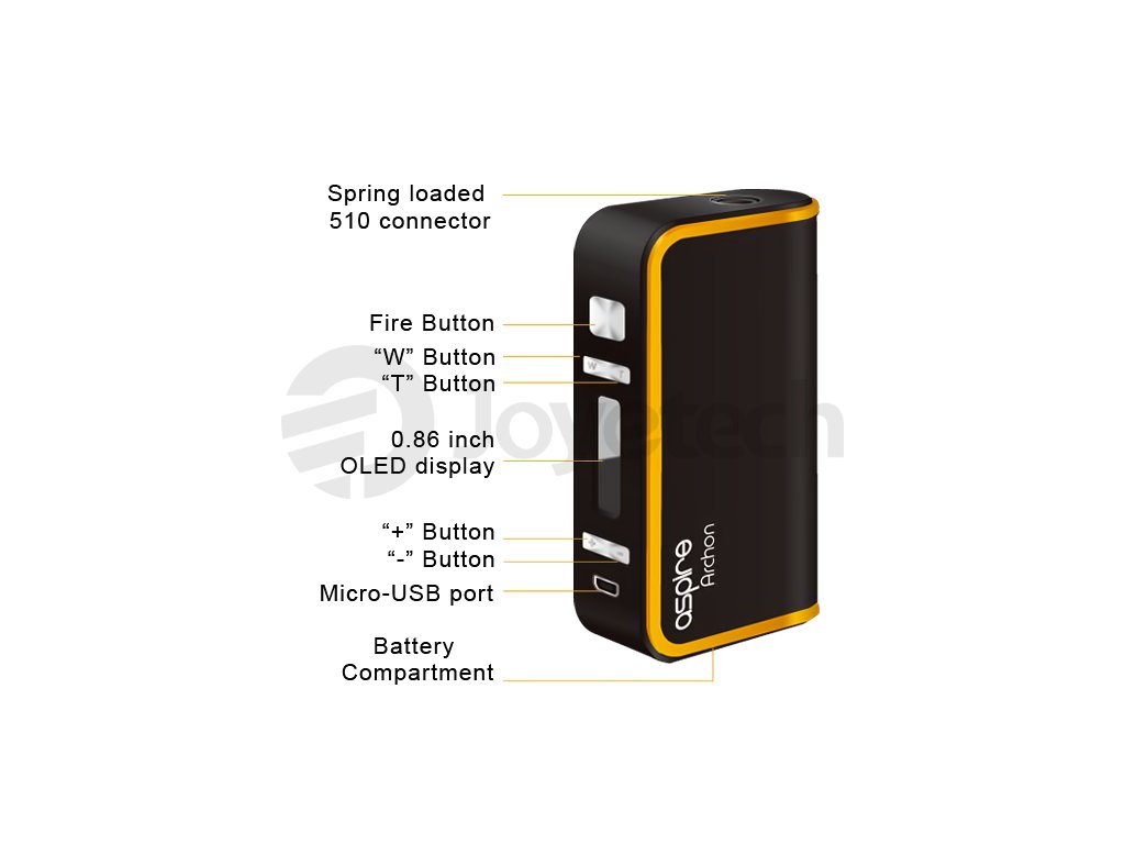 Aspire Archon je nový výkonný 150W mod na dvě 18650 baterie. Umožňuje přizpůsobit si uvítací logo pomocí několika kliků přímo na módu. Má dětskou ochranu a upgradovatelný firmware. Umožňuje přepnutí mezi VW a TC režimem pomocí jednoho tlačítka. Kryt baterií je uchycen magnety. Vzhledově atraktivní barevné kombinace, ergonomický tvar.