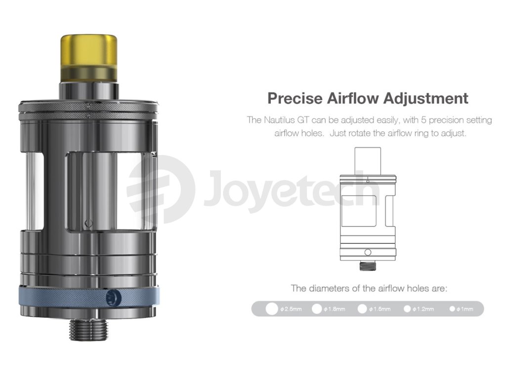 Clearomizer aSpire Nautilus GT je postaven na kvalitní základně z ušlechtilé oceli, která je doplněna o kvalitní pyrexové sklo. Celkový objem pro náplň tak činí až 3ml zásobního prostoru. Nastavitelný přívod vzduchu (Airlow) je samozřejmostí, a to v dokonalém provedení, které je přesně odstupňované celkem čtyřmi různě velikými průchody. Průchod vzduchu může být také celkově uzavřen. Díky tomu to provedení je Nautilus GT primárně určen pro oblíbený styl přímého potahování DL, nicméně v kombinaci se správně zvolenou žhavící hlavou a při vyšším omezení přívodu vzduchu lze snadno použít i pro klasický styl MTL, kdy potahujete jako z klasické cigarety. Vše završuje tolik oblíbený systém horního plnění, kdy stačí pootočit horní částí Clearomizeru a jednoduchým způsobem jí vytáhnout. K dispozici jsou dva dostatečně velké plnící otvory, kterými se plnění stane rychlou a jednoduchou záležitostí. K případné výměně žhavící hlavy stačí odšroubovat spodní základnu a samotné výměně už nic nebrání.