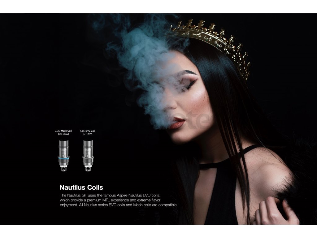 V tomto setu naleznete hned dvě Aspire Nautilus 2S žhavící hlavy. Jedna je vybavena mesh spirálou a odporem 0,7Ω a druhá je pak BVC s odporem 1,6Ω a jsou tak tedy vhodné spíše pro klasický styl potahování. Clearomizer Nautilus GT je však plně kompatibilní s řadou oblíbených žhavících hlav BVC, které už známe například s předchozích úspěšných sérií řady Nautilus, Triton aj.