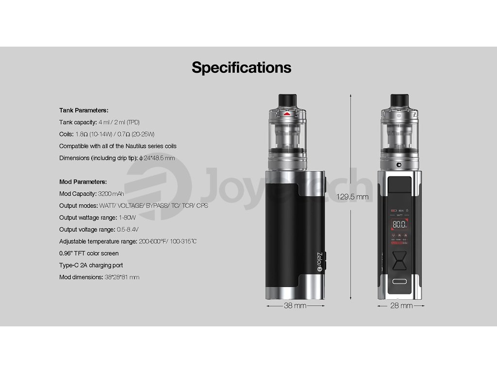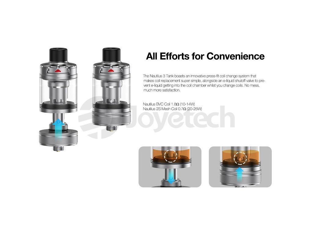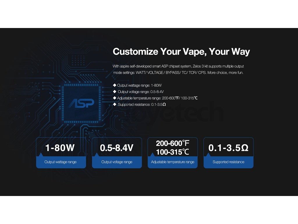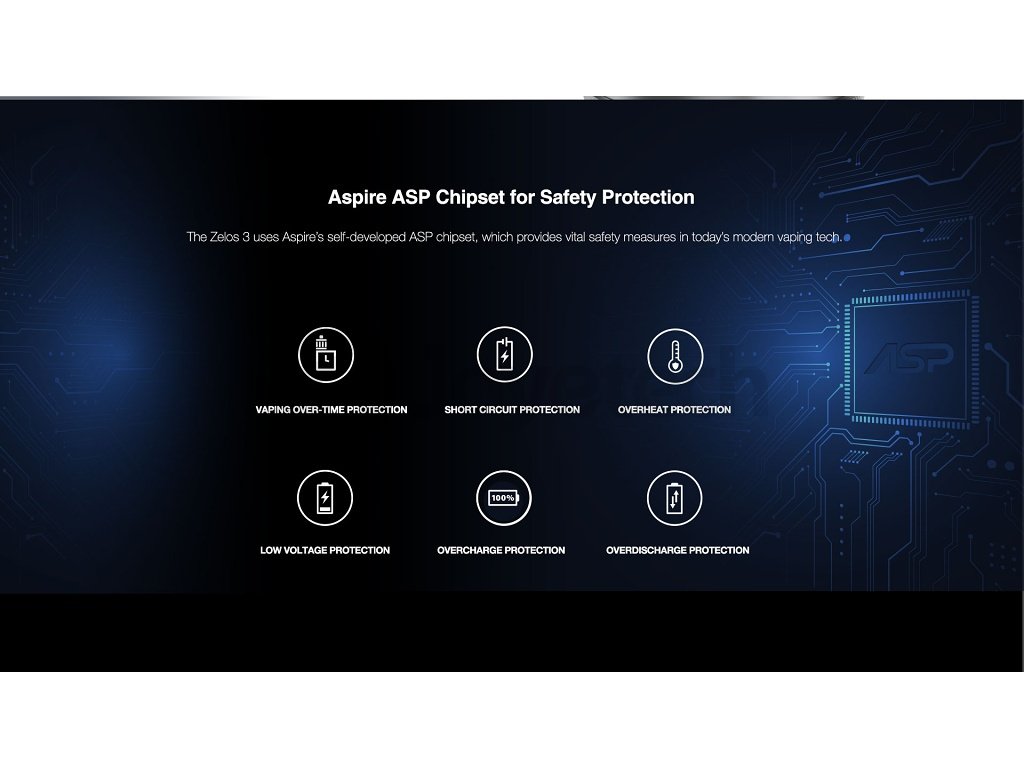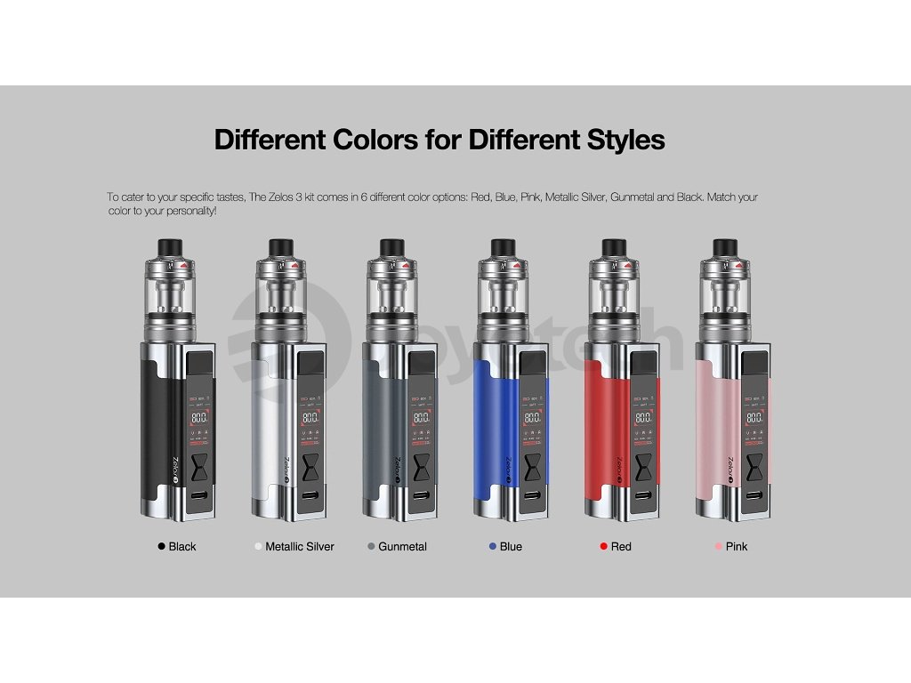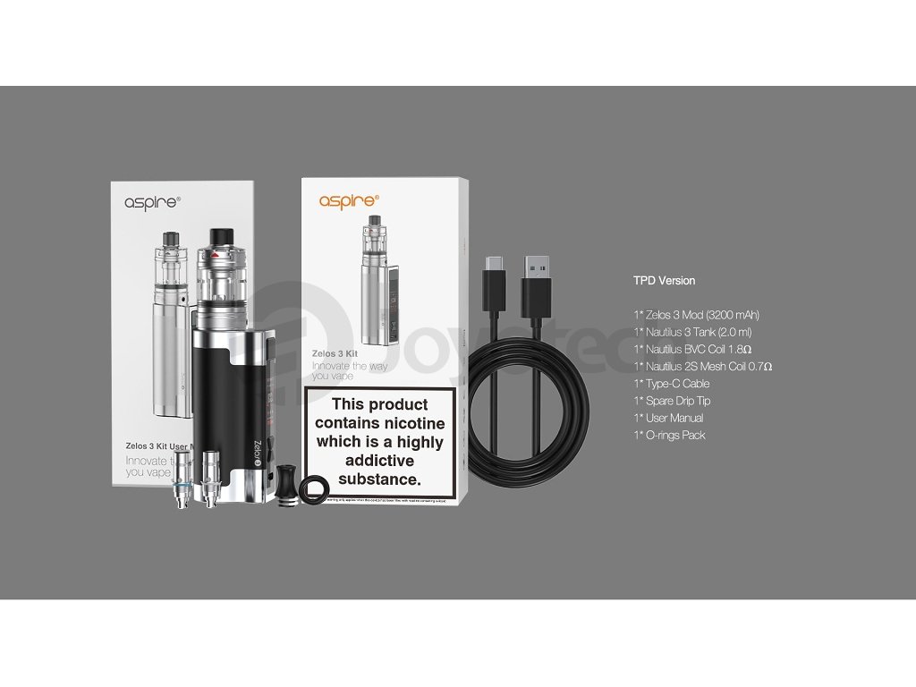 Výkonný SET Gripu Aspire Zelos 3 a Clearomizeru Aspire Nautilus 3, vyrobený z lehké zinkové slitiny, disponující vestavnou baterií s vynikající kapacitou 3200mAh. Nastavitelný výkon 1-80W, režimy VW, VV, Bypass, TC, TCR, CPS. Objem Clearomizéru 2ml, propracované Airflow, možnost použití jak MTL, tak DL, podpora žhavících hlav Nautilus BVC, 2x žhavící hlava v SETU.