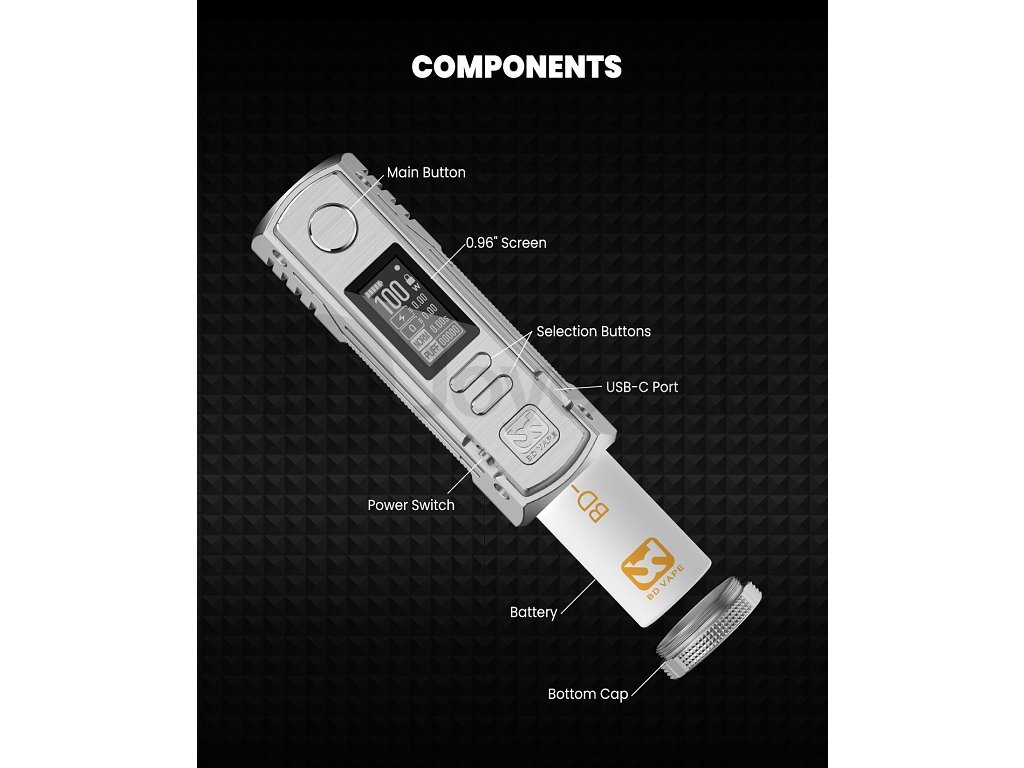 Flexibilní baterieBD Vape Mod Rayden 100 V2 podporuje baterie 18650 i 21700. Pro vyšší výkony doporučujeme články s vybitím alespoň 25A pro optimální bezpečnost a výkon. |
