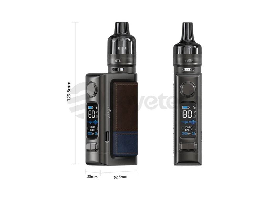 Mod nabídne také moderní a stylový design. Kovovou konstrukci zařízení doplňuje kožený potah v různých barevných variacích. Mod je tak nesmírně elegantní a hodí se jak do společnosti, tak také pro každodenní používání například v zaměstnání. Ve vrchní části modu se nachází závit typu 510, na který je v kompletním kitu našroubovaný hybridní clearomizér GTL Pod Tank s objemem 4,5 ml. Clearomizér kombinuje konstrukční výhody standardních tanků a cartridgí. Je kompatibilní s tělísky z řady Eleaf GTL, v balení najdete hned dvě. První má odpor 0,4 ohm, druhé potom odpor 0,8 ohm. Samostatně se dají pořídit také tělíska s vyšším odporem pro utažené klasické šlukování. Eleaf iStick Power 2 Kit je skutečně hrdým nástupcem již tak populárního modelu. Přesto jde ve svých kvalitách ještě dál, než jeho předchůdce.