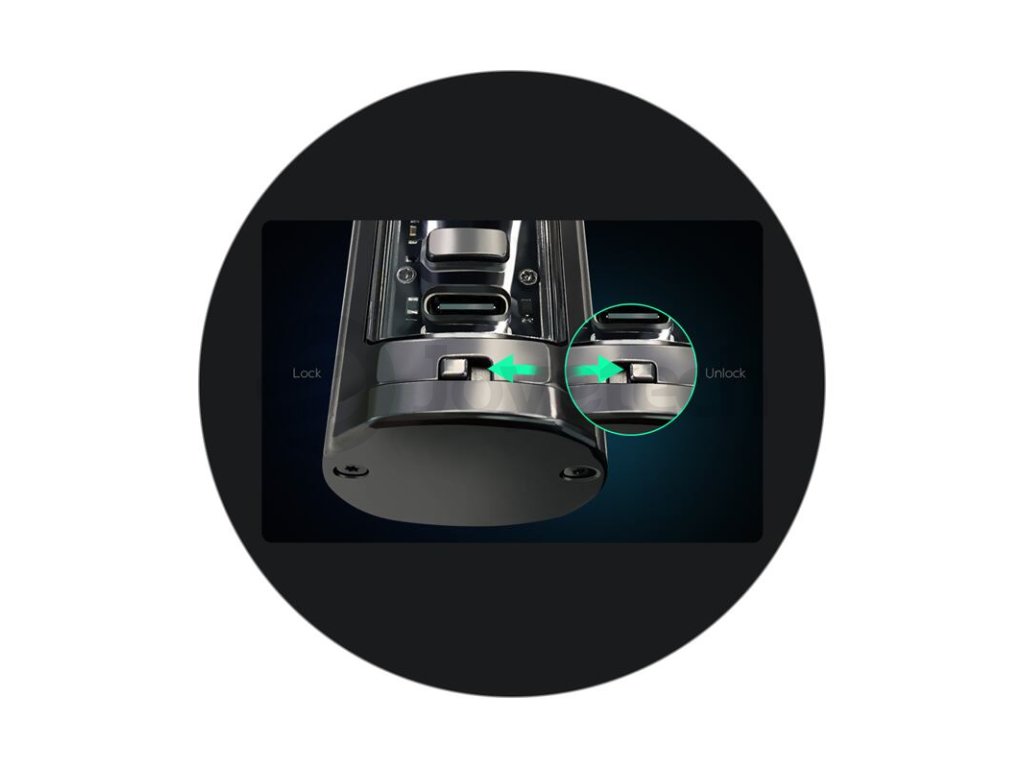 Ve spodní části modu se nachází praktický manuální zámek, který slouží pro odemčení, nebo uzamčení celého modu. V případě uzamčení zamkne ovládací regulační tlačítka, ale také spínací tlačítko. Mod tak nezačne žhavit sám od sebe, ani nepřenastaví navolené parametry při nechtěném sepnutí tlačítek při přenášení v kapse, nebo cestovním zavazadle. Jedná se o vynikající pomůcku při každodenním využití.
