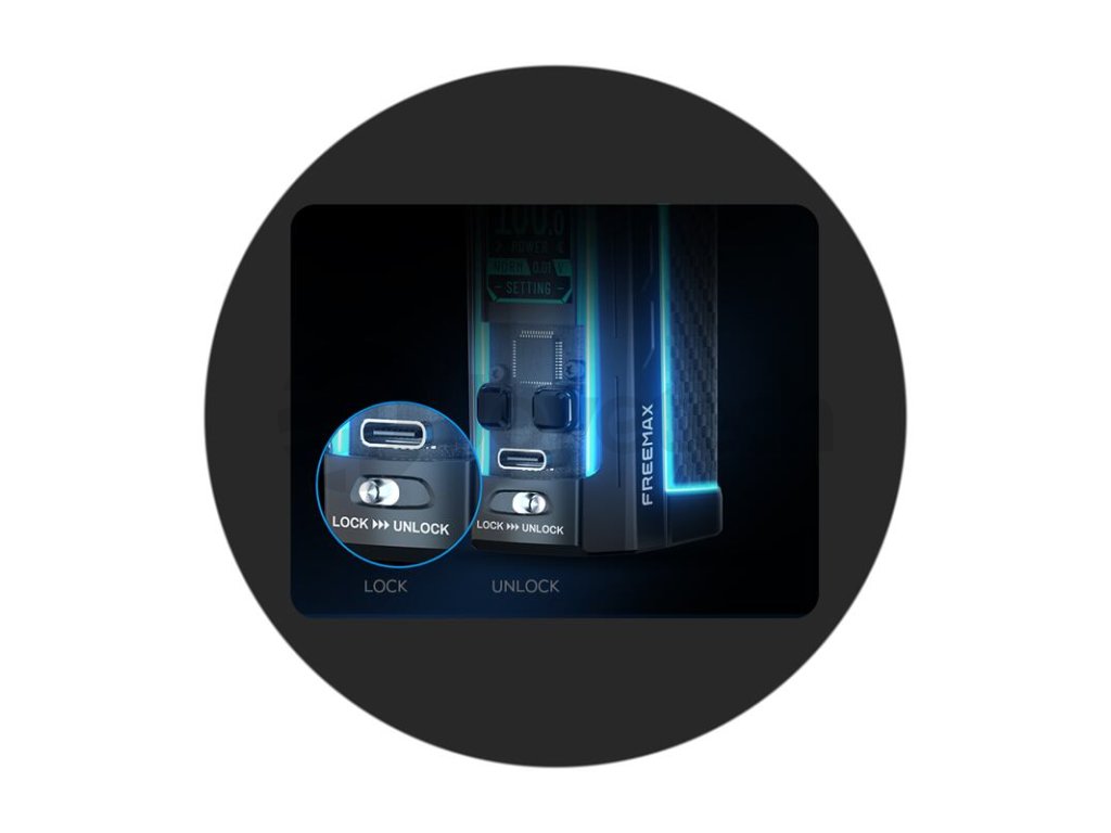 Na předním ovládacím panelu modu se nachází oblíbený prvek v podobě manuálního zámku. Jednoduchým pohybem tak můžete mod uzamknout a zabránit tak nechtěnému sepnutí, nebo přenastavení hodnot, například při častém přenášení v kapse, nebo v cestovním zavazadle. Přejetím prstu můžete mod opět jednoduše odemknout a opět se začít věnovat vapování.