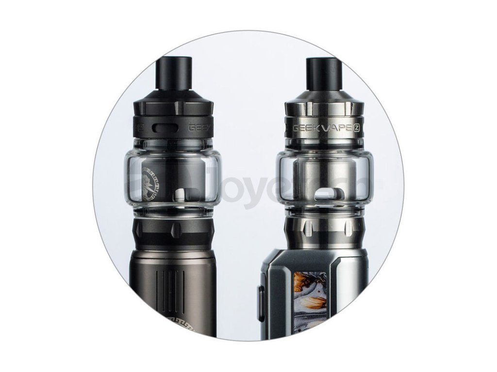 V kompletní sadě se nachází clearomizér Z Nano Tank, jedná se o novou verzi původního clearomizéru Zeus Nano Tank. Nabídne praktický systém vrchního plnění a vrchní regulaci přísunu vzduchu. Jeho objem činí 3,5 ml, v základním balení najdete ještě rovné náhradní sklo s objemem 2 ml. Clearomizér zprostředkuje mimořádný chuťový zážitek pro oba typy vapingu.