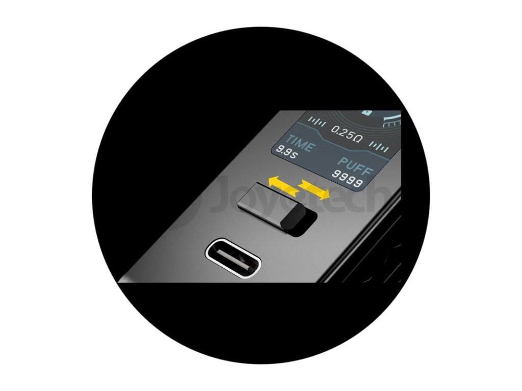 Zajímavým prvkem, který značně usnadní každodenní používání a přenášení e-cigarety, je přítomnost manuálního vypínače na předním panelu. Pro zapnutí, či vypnutí už tak nebudete muset hledat kombinace stisku spínacího tlačítka. Jednoduše posunete posuvník doprava, nebo doleva a budete mít e-cigaretu ihned připravenou k provozu, nebo k cestování.