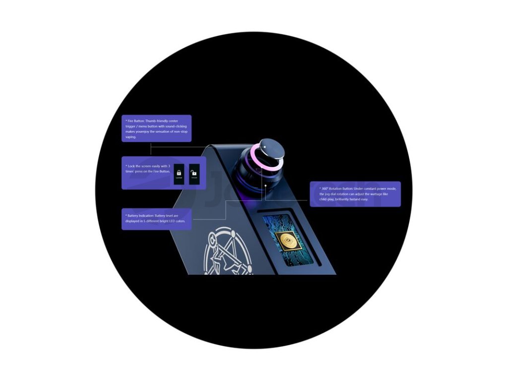 Hlavním prvkem celého modu je právě zmíněné ovládací tlačítko, které nabídne hned tři funkce. Tlačítko slouží pro spínání samotného žhavení a pro uzamčení modu, pro snadné zjištění aktuálního stavu baterie pomocí LED diody a pro regulaci samotného výkonu. Pro nastavení potřebného výkonu už tak nemusíte hledat drobná regulační tlačítka pod displejem, jednoduše budete otáčet spínacím tlačítkem a během pár vteřin si nastavíte potřebný výkon. Veškeré nastavení a základní funkce tak máte na dosah ruky a pěkně pohromadě. Zásluhou upgradovaného čipu Quest 2.0 v těle modu se můžete těšit také na bezpečný provoz, bezproblémový chod a rychlý náběh žhavení. Ve vrchní části se nachází tradiční závit typu 510 pro ukotvení libovolného atomizéru. Mod si perfektně rozumí s motacími DIY atomizéry, pro které je připraven výstupní režim RDA DIY, ale také s tradičními atomizéry, které pracují s režimem výkonu NORMAL WATT. Lost Vape Centaurus M200 Mod je precizně navržené zařízení, které splní všechny vaše požadavky a přidá ještě něco navíc.