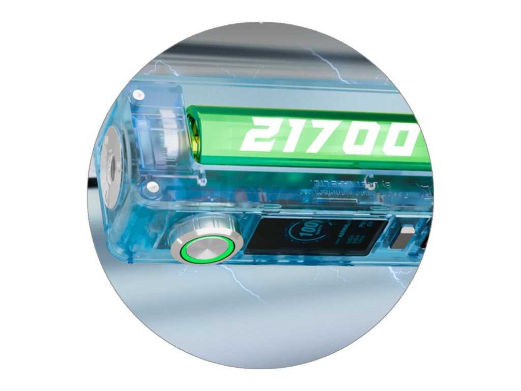 Do kompaktního těla je možné umístit vlastní externí baterii. Mod N100 disponuje slotem pro vložení jedné baterie typu 21700 nebo 18650 s přiloženým adaptérem. Díky slotu pro vlastní externí baterii získáváte obrovskou svobodu při výběru vhodné baterie přesně podle vámi preferovaného stylu vapování.