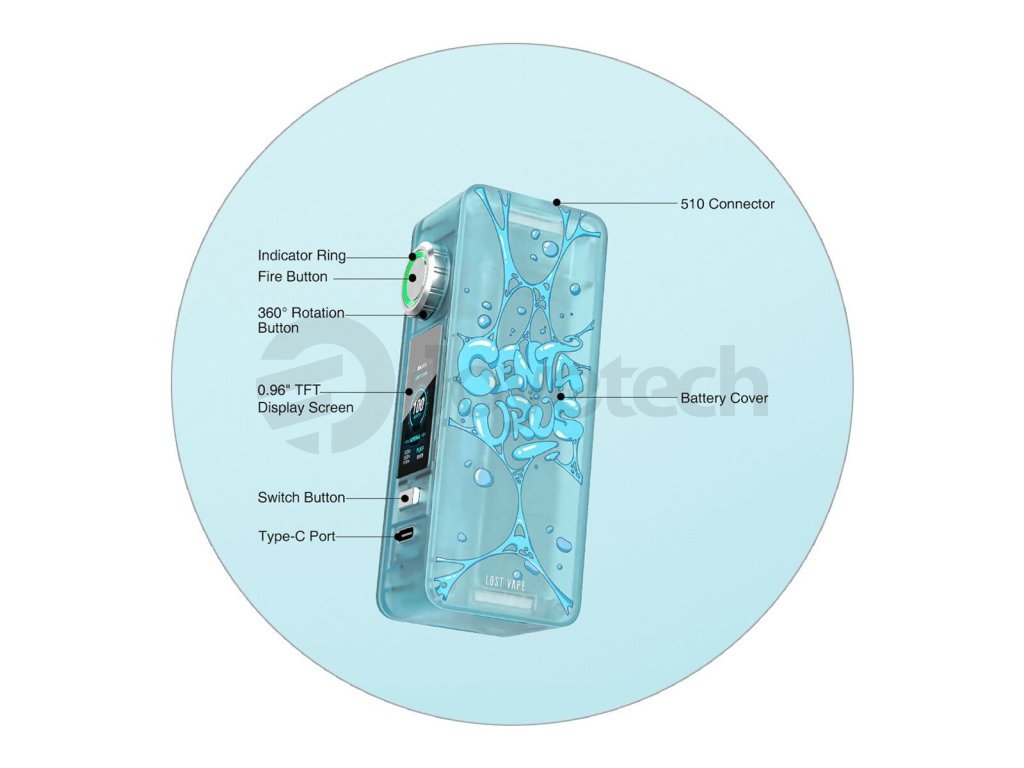 Lost Vape Centaurus N100 Mod je praktický jednobaterkový grip kombinující jedinečný styl a prvotřídní funkce díky osvědčenému čipsetu Quest 2.0. Semitransparentní konstrukce z kombinace polykarbonátu, zinkové slitiny a nerezové oceli působí futuristickým a elegantním dojmem, mod se navíc snadno užívá díky inovativnímu tlačítku s otočným kolečkem a funkcí 4v1. Díky podpoře bateriových článků 21700 nebo 18650 dodá perfektní výsledky a postará se o strhující výkon až 100 W. Se závitem 510 v horní části si potom poradí libovolný atomizér se stejným typem uchycení. Ať jste milovníky DIY vapingu nebo preferujete klasické tovární hlavy, mod si jednoduše osadíte vlastním atomizérem se závitem 510 a můžete se pustit do vapování a vychutnat si veškeré kvality kompaktního modu N100.