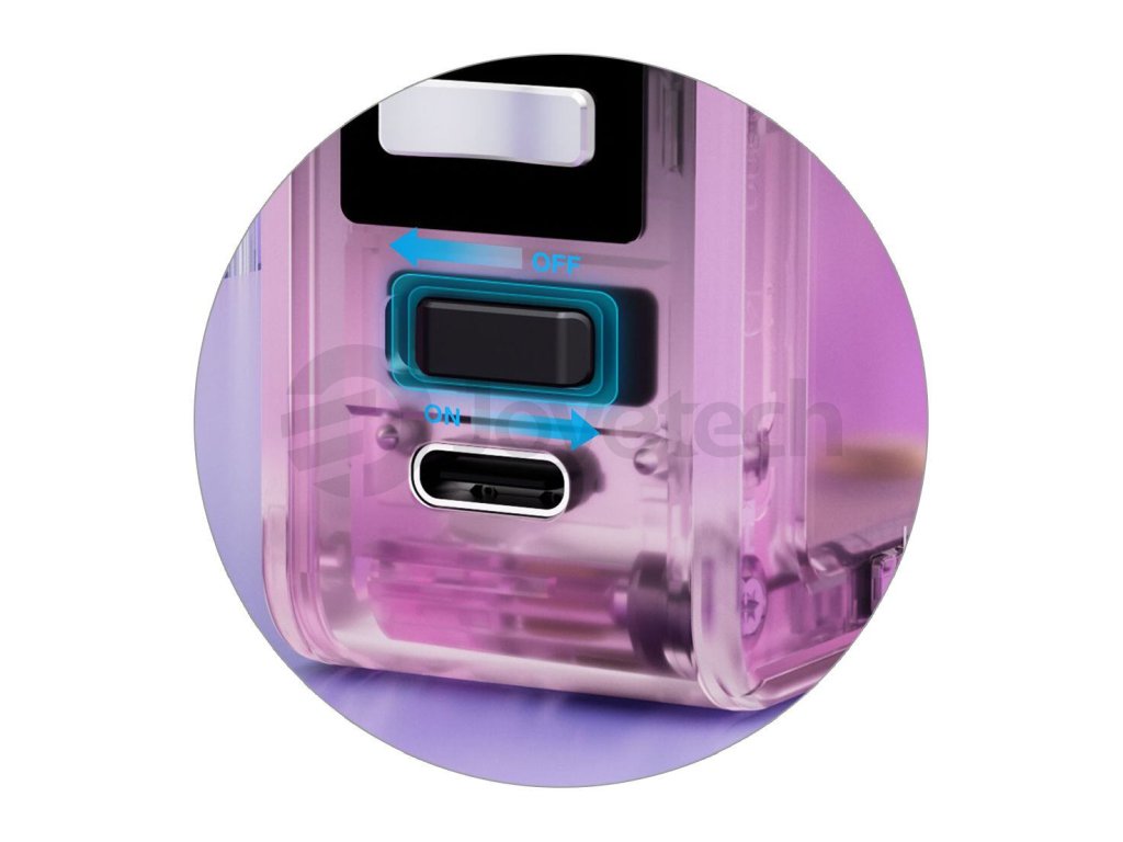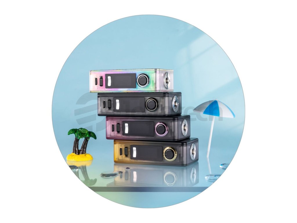 Boční panel modu ukrývá slot pro vložení dvou externích baterií typu 18650. Díky pohonu na dvě baterie si dokáže mod poradit s ohromujícím výkonem a zároveň dodat vždy skvělé a co nejoptimálnější výsledky při vapování. Samozřejmostí je také praktická podpora nabíjení baterií přímo v modu. Tělo modu je vybaveno portem USB-C a mod podporuje nabíjení 2A.