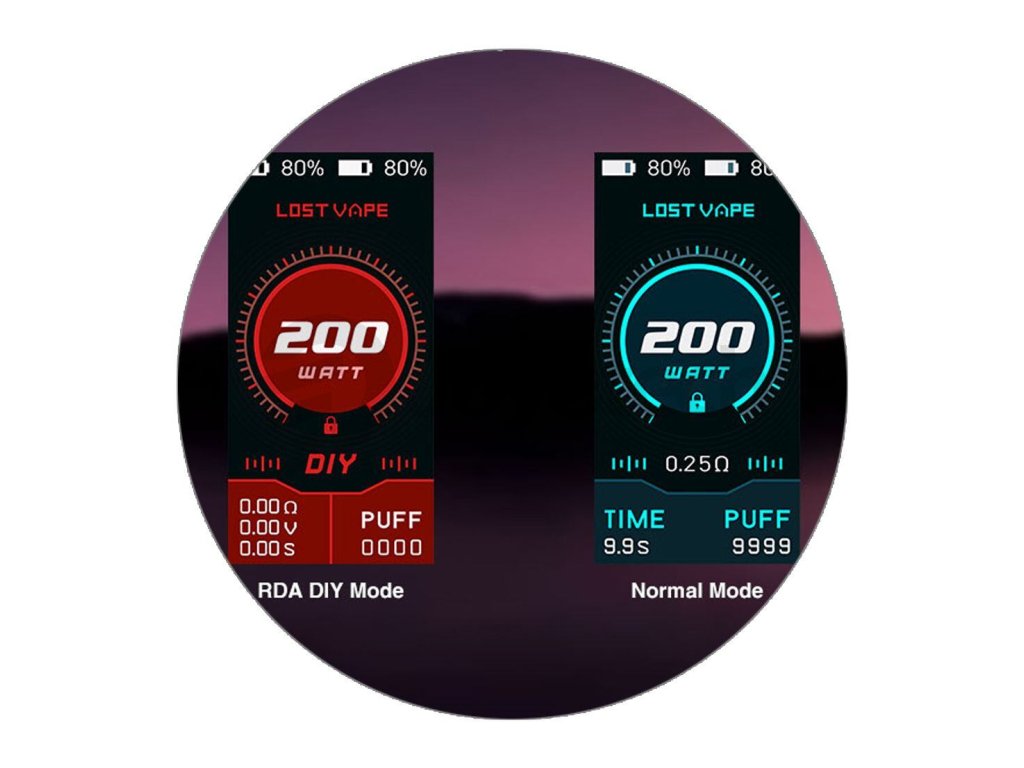 Díky integrovanému čipsetu Quest 2.0 se můžete těšit nejen na pohodlné a rychlé nastavení a přehledné ovládání, ale také na bezpečný provoz a dva výstupní režimy. Hlavním režimem je základní Normal režim s regulací výstupního výkonu a přehlednými informacemi na displeji. Pokud používáte motací atomizér, doporučujeme přepnout na režim DIY, který umožňuje rovněž regulovat výkon, na displeji však zobrazuje navíc také hodnotu výstupního napětí baterií během potahu.