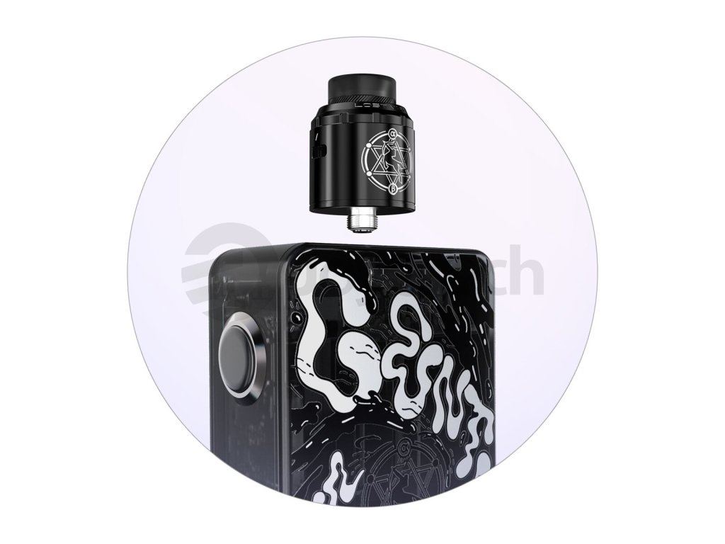 Ve vrchní části modu se nachází tradiční závit typu 510, díky čemuž je mod kompatibilní s drtivou většinou atomizérů na současném trhu. Hravě si poradí jak s tradičními atomizéry na tovární žhavící hlavy, tak také s DIY atomizéry pro vlastní spirálky. Horní část nedisponuje žádným zkosením, pro instalaci vašeho atomizéru tak máte dostatek prostoru a nemusíte se obávat nevzhledných přesahů ani u průměrově silnějších atomizérů.