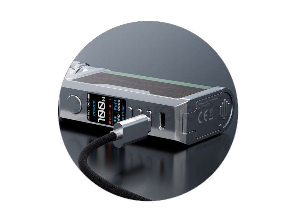 Ve spodní části modu se nachází praktický kryt pro baterie. Mod pracuje se dvěma externími bateriemi typu 18650, které zajistí hladký chod a nekompromisní výkon. Vaše vlastní baterie si poté budete moci kdykoliv pohodlně dobíjet přímo v modu, na předním panelu se nachází rychlý port USB-C pro dobíjení baterií proudem až 1,8 A.