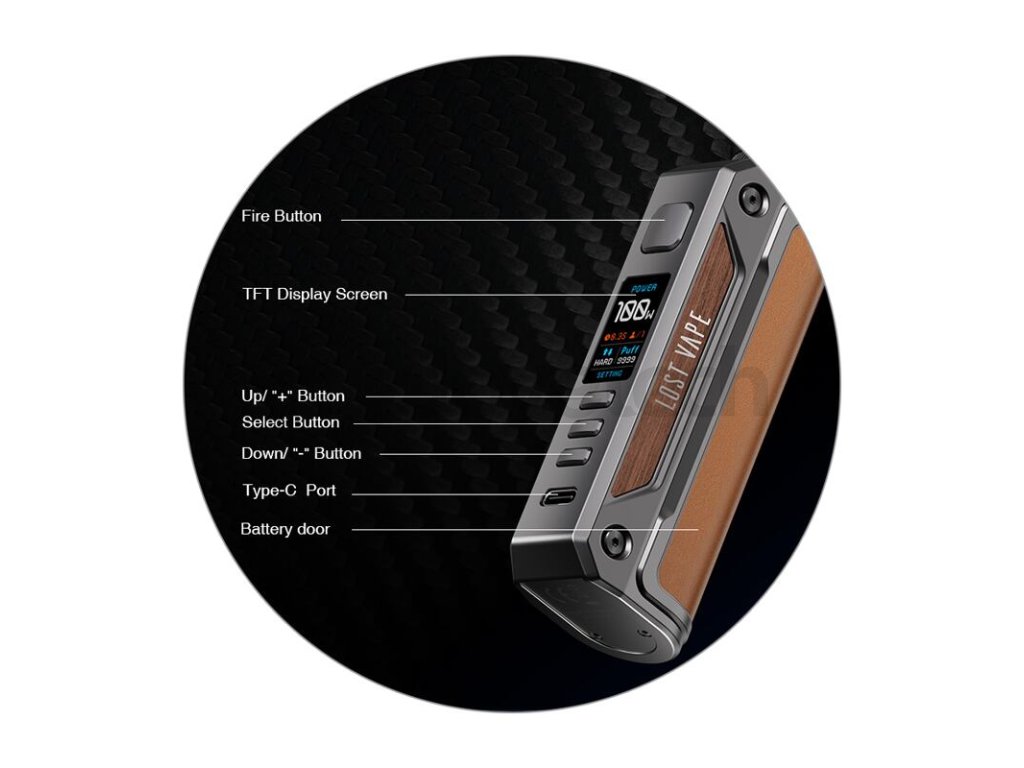 Lost Vape Thelema Solo přichází s intuitivními ovládacími prvky, které můžete znát z předchozích modů Lost Vape. V přední části se nachází velké spínací tlačítko a tři ovládací kompaktní tlačítka pro pohodlné nastavení všech požadovaných parametrů. Displej nabídne dostatečnou čitelnost a přehlednost, rozhraní je jednoduché a nesmírně uživatelsky přívětivé.