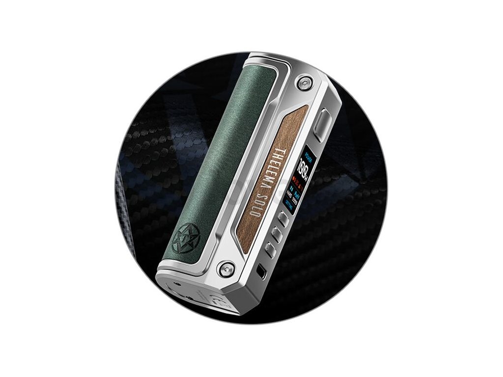 Oblíbený výrobce prémiových modů Lost Vape se vrací na scénu s vyladěným modem pro každodenní využití. Lost Vape Thelema Solo Mod je sympatický jednobaterkový mod s luxusním designem a prvotřídním čipem Quest 2.0, který působí nejen elegantním dojmem, ale zároveň dodá každému potahu také potřebný výkon a ten správný říz. Mod nabídne praktické rozměry, které činí jen 104 x 32,6 x 44,2 mm. Tělo je vyrobeno z kvalitní zinkové slitiny, kterou doplňuje kryt baterie v zadní části potažený kůží, nebo karbonem. Do těla modu je možné nainstalovat jednu baterii typu 21700 pro dosažení maximálního výkonu až 100 W. Samozřejmostí je potom možnost použití také menší baterie typu 18650 s adaptérem. Svou vlastní baterii si budete moci pohodlně dobíjet přímo uvnitř modu díky portu USB-C. Ve vrchní části modu potom najdete závit typu 510 pro kompatibilitu se stejným typem závitu u vašeho atomizéru. Díky široké vrchní ploše mod skvěle pracuje s atomizéry do průměru až 28 mm.