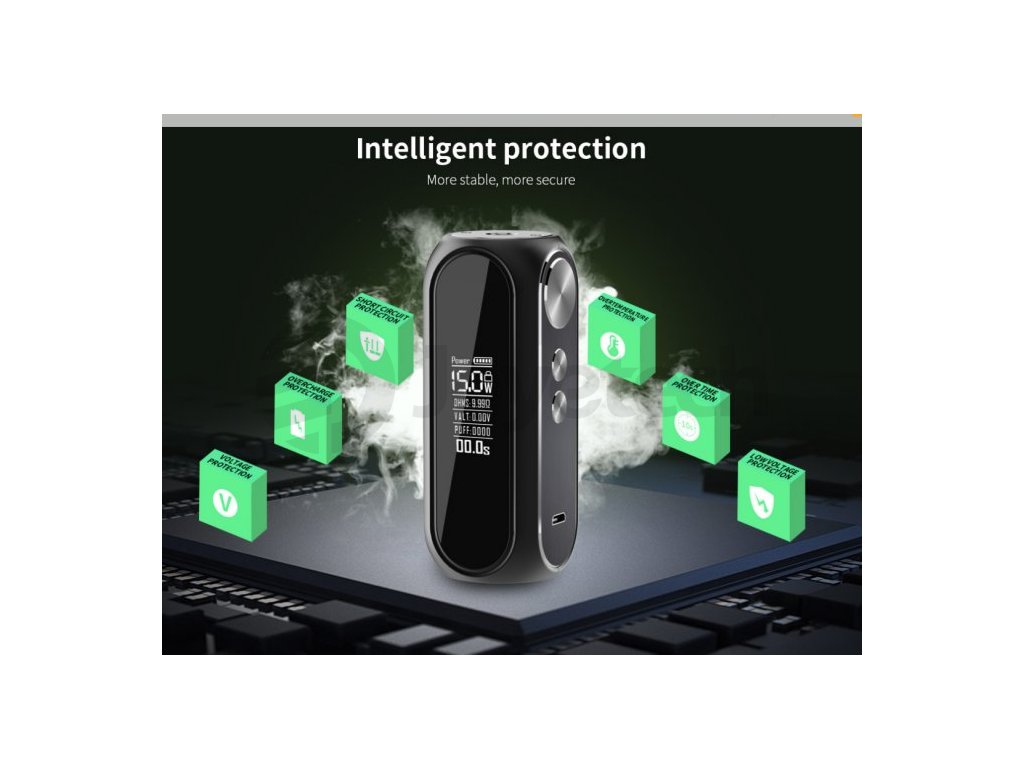 OLED displej: Zobrazení stavu nabití, odporu atomizeru, aktuálního výkonu, teploty, napětí a režimu