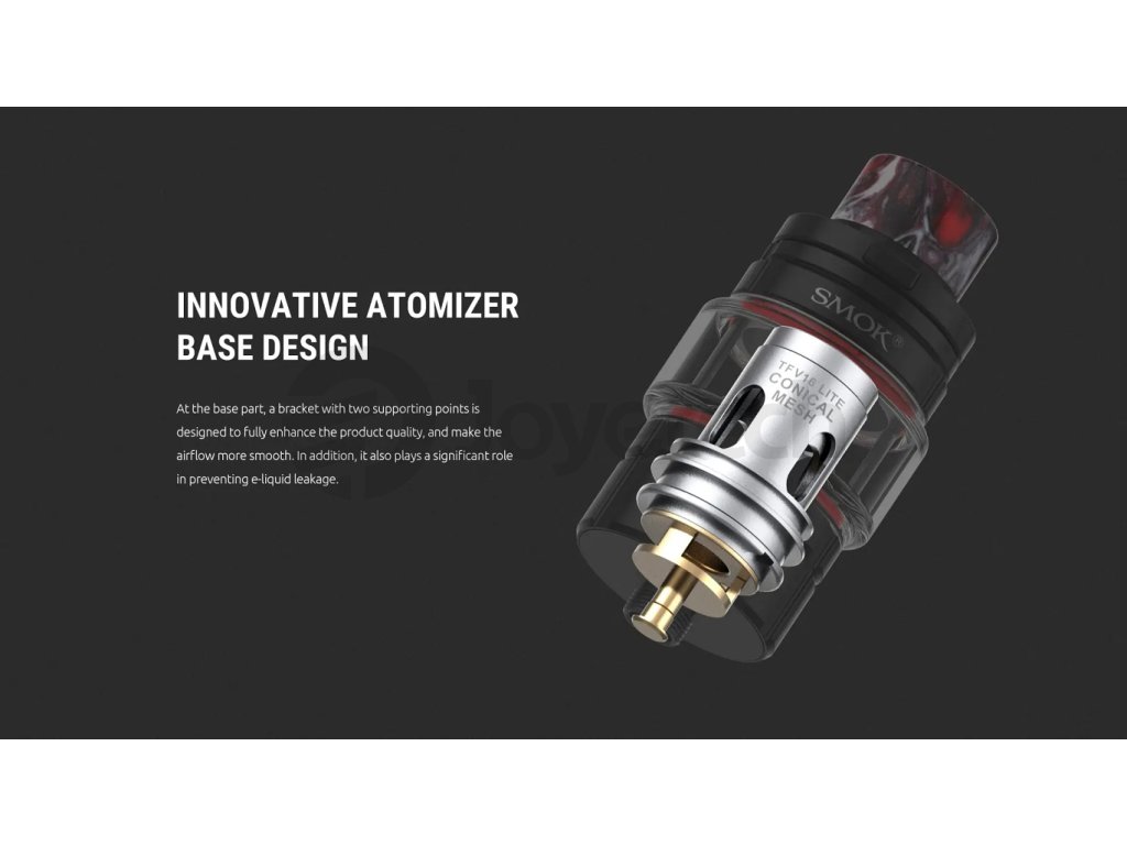 Samotnou kapitolu pak představuje Nízkoodporový Tank clearomizer Smok TFV16 Lite, který je součástí tohoto setu. Clearomizer Smoktech TFV16 disponuje objemem celých 5ml zásobního prostoru pro e-liquid. Zároveň s tímto clearomizerem přichází zcela nové žhavící hlavy nesoucí stejné označení TFV16, které jsou osazeny hitem poslední doby, a to Mesh spirálkami, díky kterým se dá dosáhnout opravdu velké produkce páry. Samozřejmostí je pak možnost regulace přívodu vzduchu. Průchod může být také téměř celkově uzavřen. Díky tomu to provedení je Smok TFV16 primárně určen pro oblíbený styl přímého potahování DL, nicméně v kombinaci se správně zvolenou žhavící hlavou a při vyšším omezení přívodu vzduchu lze snadno použít i pro klasický styl MTL, kdy potahujete jako z klasické cigarety. Plnění e-liquidem je rovněž velmi praktické a probíhá pootočením horní části clearomizeru proti směru hodinových ručiček, kde se skrývá samotný otvor pro plnění.