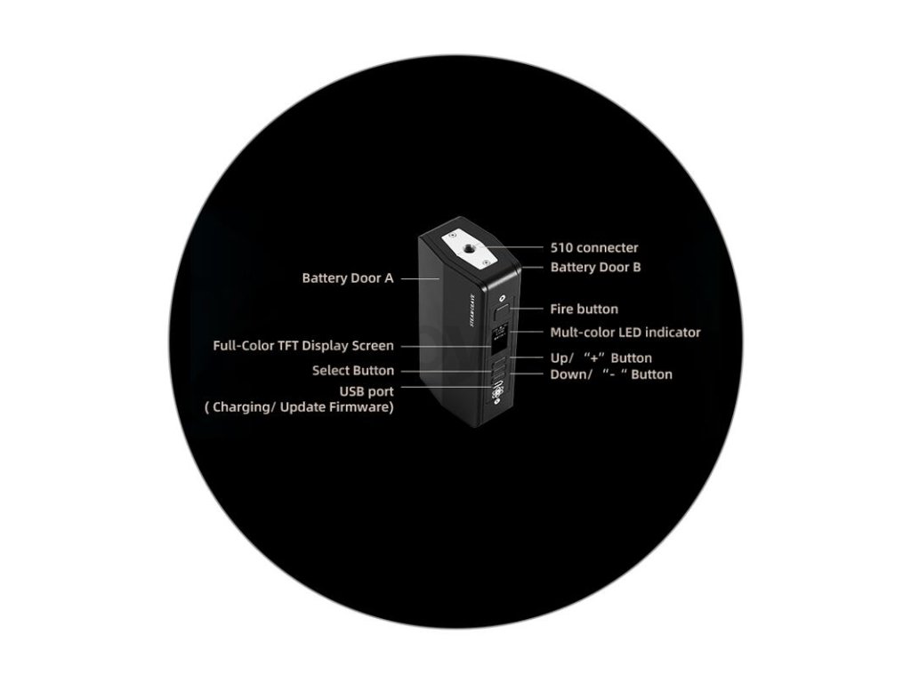 V přední části se na ovládacím panelu nachází port pro připojení dobíjecího kabelu. Jedná se o port micro USB. Mod podporuje extrémně rychlé a efektivní dobíjení proudem až 3 A. Stav nabíjení budete potom pohodlně sledovat přímo na displeji modu.