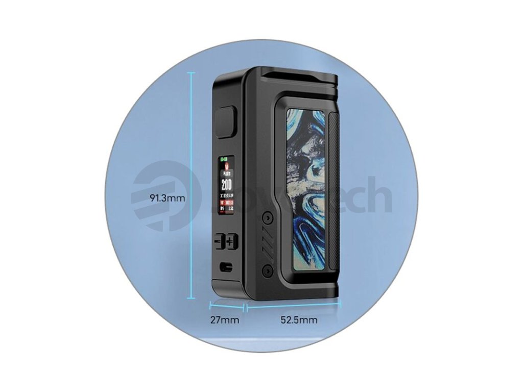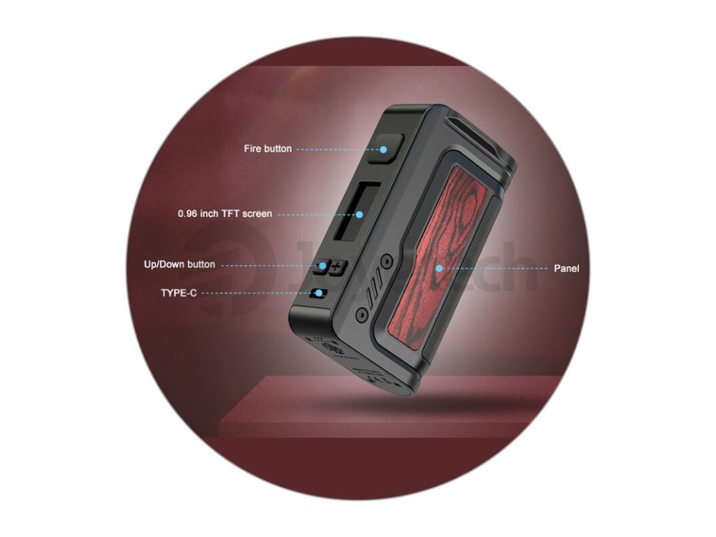 Mod pracuje se dvěma bateriemi typu 18650, které se do těla vkládají po vysunutí zadního panelu. Díky pohonu na dvě baterie se můžete těšit na nekompromisní výstupní výkon, který dosahuje až 200 W. Samozřejmostí je podpora dobíjení obou baterií přímo v modu díky portu USB-C, který se nachází na předním panelu. Lze dobíjet proudem až 1,8 A.