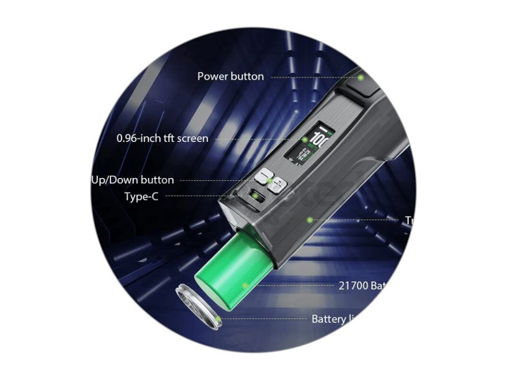 Ve spodní části modu se nachází uzávěr pro slot baterie, mod pracuje s jednou baterií typu 21700, lze však používat také standardní baterie 18650 díky přiloženému adaptéru. Díky pohonu na baterii 21700 můžete mod osadit vysokokapacitním článkem pro potřeby DL, nebo MTL potahu a pro dlouhou výdrž celého modu. Baterii budete moci pohodlně dobíjet přímo v modu díky rozhraní USB-C.