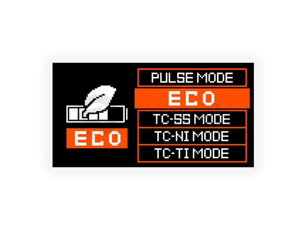 Ovládací panel s displejem v přední části umožňuje hladké a rychlé nastavení všech parametrů. U modu navíc máte na výběr ze široké nabídky výstupních režimů. Pro milovníky režimu výkonu je připraven režim F(t) pro zisk co nejlepší chuti, případně subrežim SMART pro automatické doporučení vhodného výkonu. Pokročilejší uživatelé se mohou těšit na režimy PULSE, nebo TC režimy pro niklové, titanové a nerezové spirálky.
