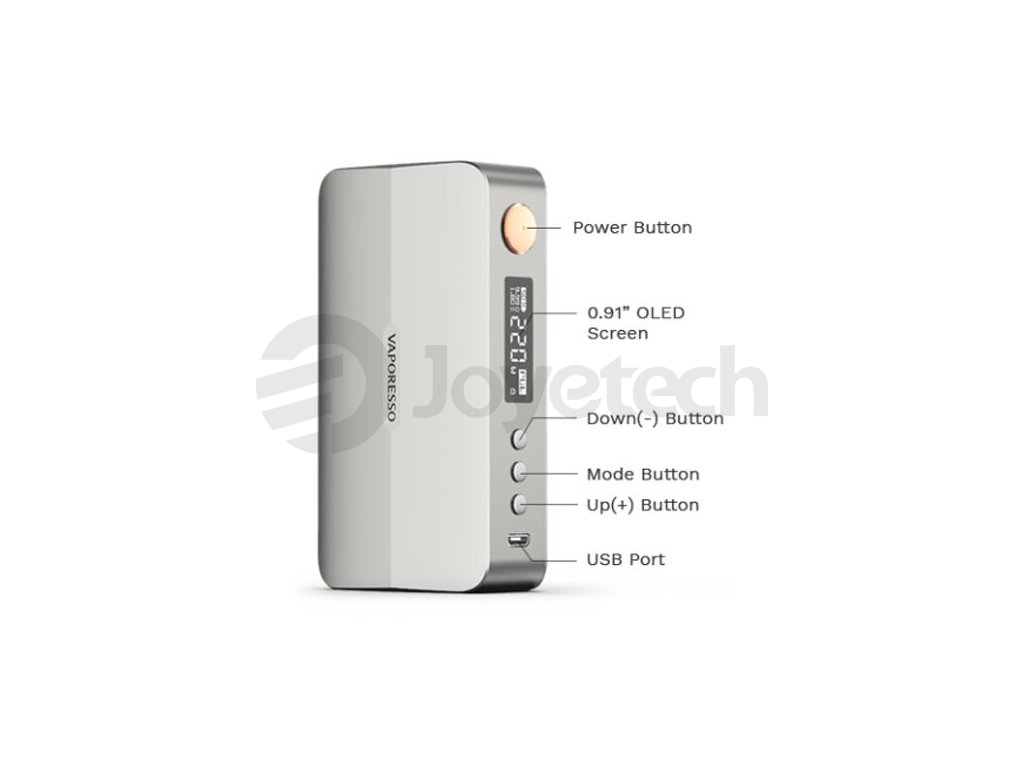 Tělo modu ukrývá slot pro dvě baterie typu 18650. Tyto baterie nejsou součástí základního balení a je nutné dokoupit je samostatně. Díky pohonu na dvě baterie je možné u modu nastavit výstupní výkon až 220 W. Baterie si budete moci také pohodlně dobíjet přímo v modu díky přítomnosti portu micro USB. Mod podporuje dobíjení proudem až 2,5 A.