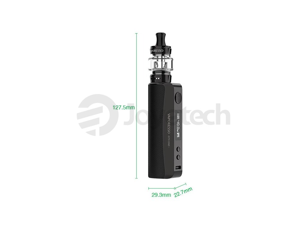 Grip Vaporesso GTX ONE se prezentuje vestavěnou baterií o kapacitě 2000mAh s rychlým 2A USB-C nabíjením a nastavitelným výkonem až 40W. Propracovaná konstrukce gripu disponuje přehledným 0,69 palcovým displejem a pohodlným spínacím tlačítkem. Mezi jeho další přednosti patří ochrana proti zkratu, přehřátí a nízkému odporu. Všechny fanoušky MTL a DTL vapování potěší přiložený clearomizer GTX Tank s vrchním plněním, objemem nádržky 3ml a žhavicími hlavami GTX o odporu 0,8ohm a 1,2ohm. Celý clearomizer je plně rozebíratelný = snadná údržba. Regulace přívodu vzduchu pro nastavení optimální kouřivosti se nachází ve spodní části.