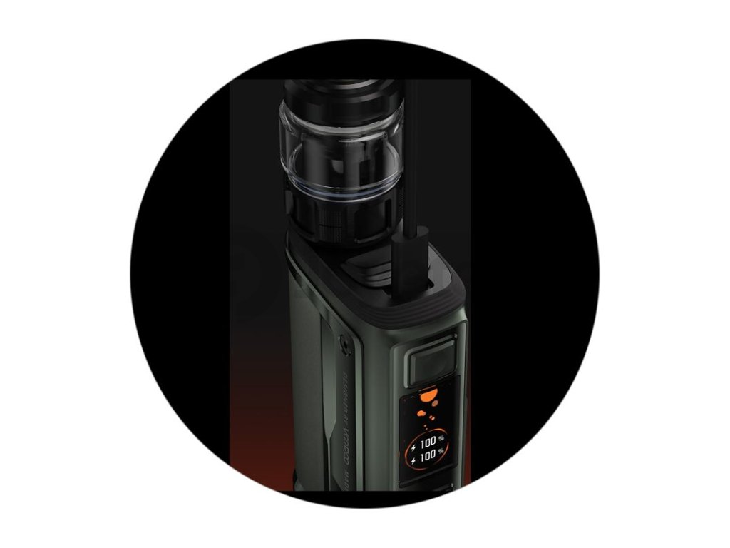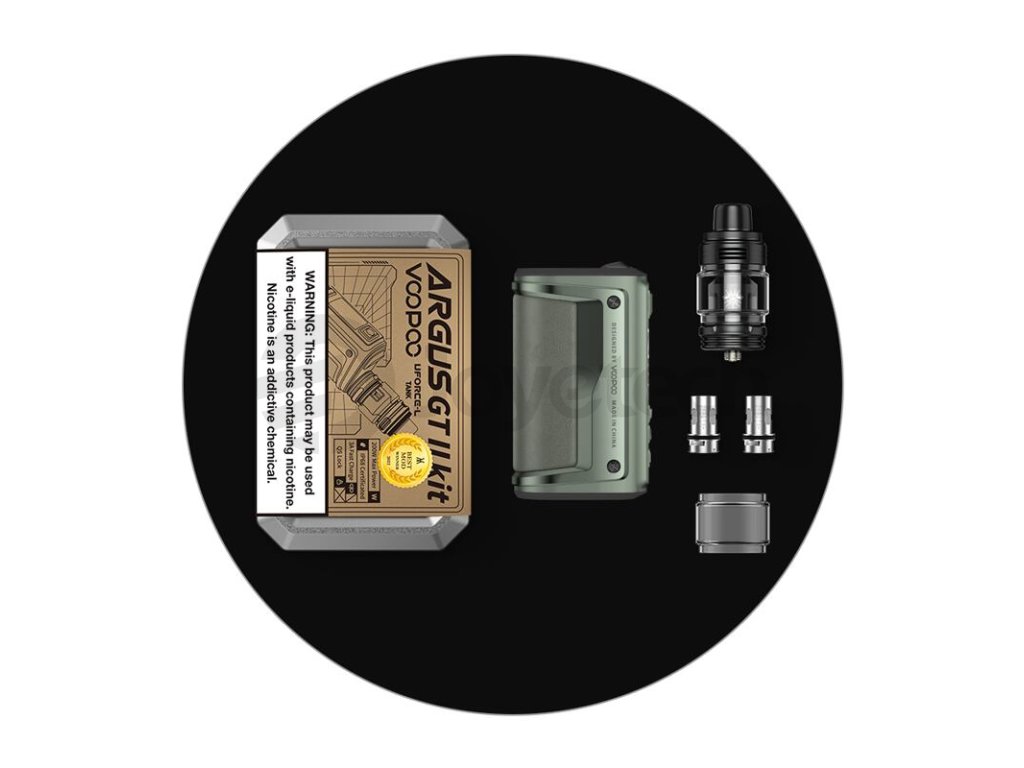 Upgradované balení modelu Argus GT II Kit nabídne nový clearomizér VooPoo UFORCE-L Tank pro přímé potahování do plic. Tento clearomizér disponuje obrovským základním objemem 5,5 ml a nabídne jednoduché vrchní plnění a vrchní systém airflow pro zisk co nejlepší chuti během potahování. Příjemně dokresluje design modu a esteticky ladí s jeho křivkami.