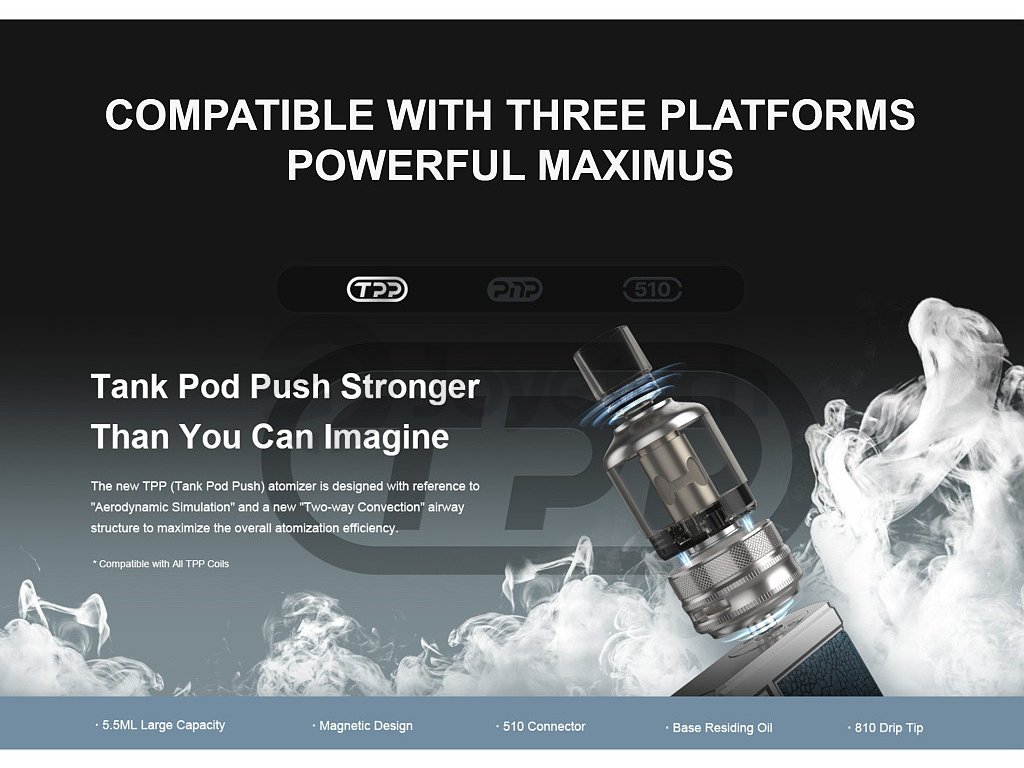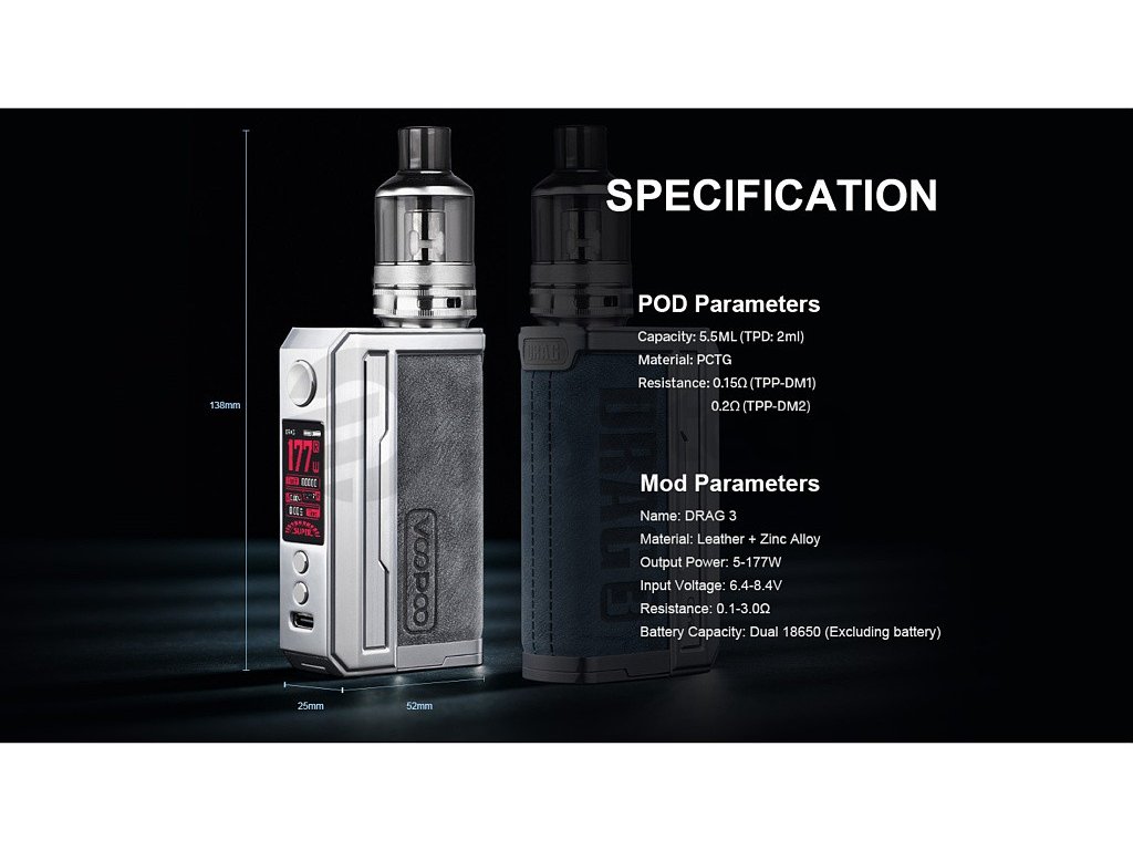Vysoce výkonný Set prvotřídního Gripu od společnosti Voopoo, na baterie 18650, výkon až 177W, prvotřídní čip GENE.FAN 2.0, Režimy Smart, RBA, Super, TC. Balevný OLED displej, USB-C nabíjení, Špičkový Voopoo TPP Pod Tank Clearomizér s kapacitou 5,5ml. 2x žhavící hlava Voopoo TPP v Setu. Závit 510, materiál zinková slitina, kůže, PCTG.