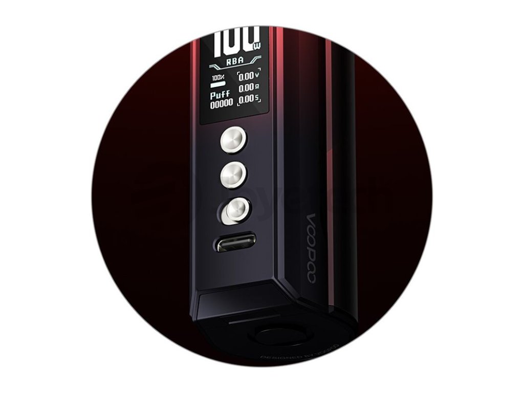 Díky pohonu na jednu baterii si mod poradí s výstupním výkonem až 100 W, výkon lze potom libovolně regulovat v rozpětí 5 - 100 W ve standardním režimu. Tělo modu je poháněno čipsetem GENE TT 2.0, který nabídne pohodlné ovládání, přehledné uživatelské rozhraní, širokou nabídku režimů, skvělý power management a řadu bezpečnostních ochran. Mod lze používat jak s režimem výkonu, tak také v režimu SMART, nebo s teplotními režimy pro niklové, titanové a nerezové spirálky. Vše si pohodlně nastavíte na předním panelu pomocí regulačních tlačítek a velkého displeje. Na předním panelu najdete také dynamický manuální přepínač, který lze nakonfigurovat pro odemykání a zamykání modu, pro zapínání a vypínání modu, nebo pro uzamykání výkonu. Legendární nadčasový design a bohaté funkce, to je VooPoo Drag M100S.