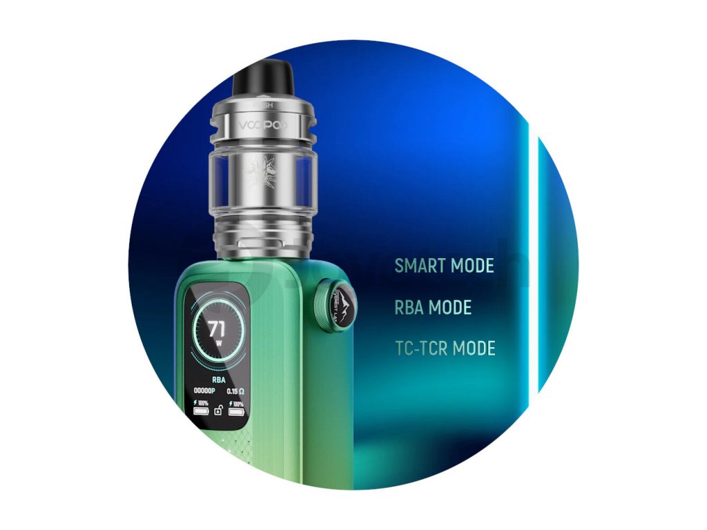 Upgradovaná verze integrovaného čipsetu umožňuje výběr hned ze tří režimů vapování. V režimu Smart s automatickou detekcí odporu žhavící hlavy elektronika sama zvolí optimální nastavení a omezí maximální výkon pro daný typ tělíska. Ovládání modu je tak dostatečně jednoduché i pro méně zkušené vapery. RBA režim nabízí zcela variabilní nastavení výkonu od 5 do 220 W po 1 W, díky čemuž můžete experimentovat s výslednou chutí a množstvím páry. Poslední režim TC-TCR je určen pro vyznavače DIY vapingu a umožňuje regulaci podle teploty se čtyřmi přednastavenými typy vodičů - SS316, SS430, Ni200 a Titanium.