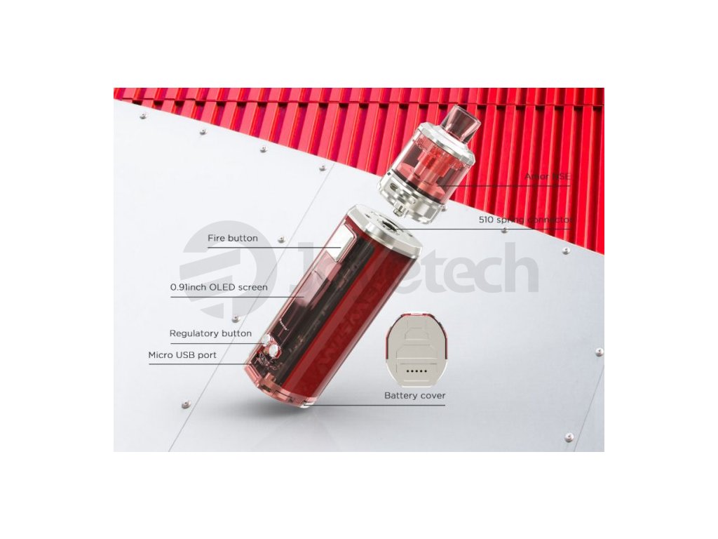 Propracovaný designe, MTL a DL styl potahování, 2A nabíjecí proud pro rychlé nabíjení nebo nastavitelný výkon až 80W, to je stručný popis gripu Sinuous V80 od společnosti Wismec. Po vložení monočlánku typu 18650 si můžete vybrat mezi teplotními režimy Ni, Ti, SS, TCR, Bypass nebo klasickým výkonem. Přehledný 0,91 palců veliký OLED displej budete mít pod stálým dohledem na boční straně vedle spínacího tlačítka. Mezi jeho další přednosti patří ochrana proti zkratu, přehřátí, přebití a podbití , 10-ti vteřinová ochrana žhavení a aktualizace firmware. Společně s clearomizerem Amor NSE se můžete těšit na pořádný příděl páry za asistence autentické chuti liquidu. Využívá systém horního plnění - po odsunutí vrchní části plníte liquid otvorem přímo do těla clearomizeru o objemu 3ml. Je kompatibilní se žhavicími hlavami řady WS. Celý clearomizer je plně rozebíratelný = snadná údržba. Regulace přívodu vzduchu pro nastavení optimální kouřivosti se nachází ve spodní části.