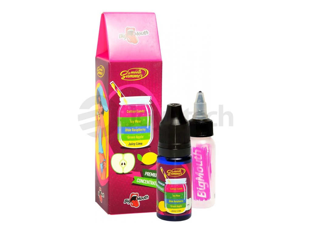 Mix cukrové vaty, ledové hrušky, maliny, zeleného jablka a šťavnaté limetky... Příchutě Big Mouth jsou jedny z nejlepších příchutí pro tvorbu vlastních liquidů. Součástí designového balení je 10ml lahvička s příchutí a 30ml lahvička pro namíchání liquidu. Výroba probíhá za nejpřísnějších hygienických standardů ve farmaceutické laboratoři. Jedná se o koncentrát, který se kape do báze. Příchuť může být použita pouze jako aroma do bází....nejedná se o hotový liquid.