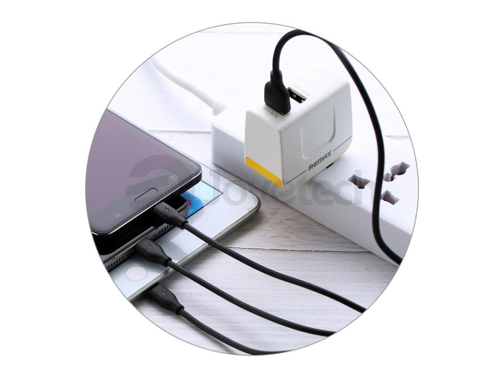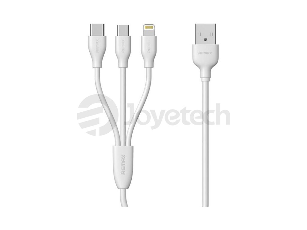 Univerzální a multifunkční dobíjecí kabel 3v1 REMAX SUDA slouží pro všechna zařízení disponující micro USB slotem, USB-C slotem, nebo Lightning slotem pro dobíjení. Samotný kabel disponuje třemi koncovkami, které slouží pro dobíjení různých zařízení. Hlavní výhodou tohoto kabelu je možnost dobíjení až třech zařízení současně. Můžete si tak pohodlně dobíjet elektronickou cigaretu, mobilní telefon a případně například tablet, nebo jakékoliv jiné zařízení. Na kabelu najete koncovky micro USB, USB-C a Lightning (pro zařízení Apple).