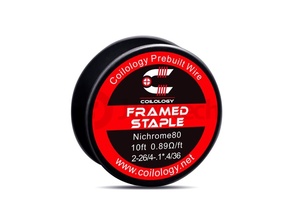 Coilology Framed Staple Ni80 je vysoce kvalitní odporový drát renomovaného výrobce Coilology. Drát je vhodný pro výrobu spirálek určených k vapingu a pro DIY atomizéry. Drát je vyrobený z nichromu, přičemž jeho jádro je tvořeno dvěma odporovými dráty (2-26GA; 2* 0,4 mm) a čtyřmi plochými odporovými dráty v jádru s rozměry 0,1 * 0,4 mm, celé jádro je potom omotáno tenkým nichromovým drátem s průměrem 0,13 mm (36GA). Drát je určený pro používání v režimu výkonu. Nelze ho použít pro teplotní režimy. Drát typu Framed Staple je vhodný pro cloudchasing a nízkoodporový vaping a pro