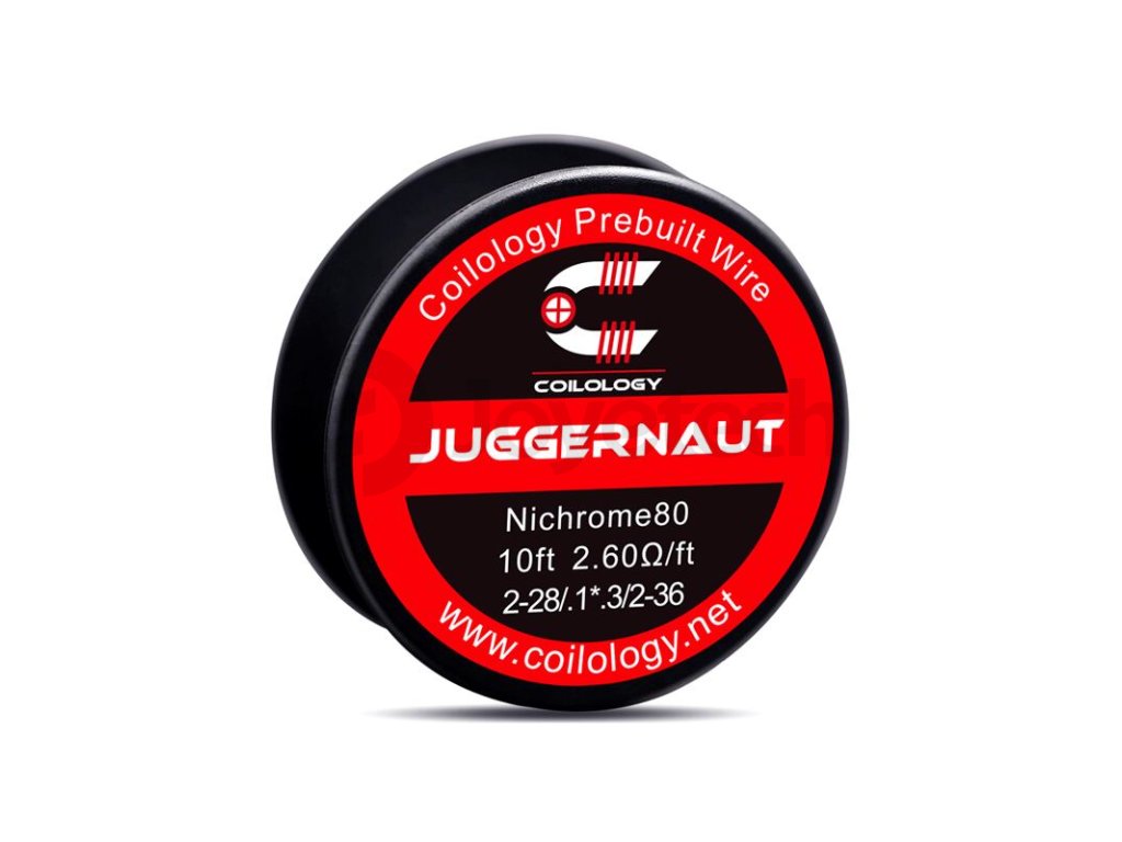 Coilology Juggernaut Ni80 je vysoce kvalitní odporový drát renomovaného výrobce Coilology. Drát je vhodný pro výrobu spirálek určených k DL vapingu. Drát je vyrobený z nichromu. Odporové dráty Juggernaut tvoří dva dráty s jádrem 2* 0,3 mm (2* 28GA), tyto dráty jsou omotány dvěma tenkými dráty v konfiguraci 2* 0,13 mm (2* 36GA). Oba tyto clapton dráty jsou k sobě následně připojené a stažené prostřednictvím pevného plochého drátu s rozměry 0,1 * 0,4 mm. Tento složitější odporový drát je ideální volbou pro cloudchasing,