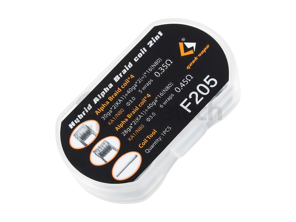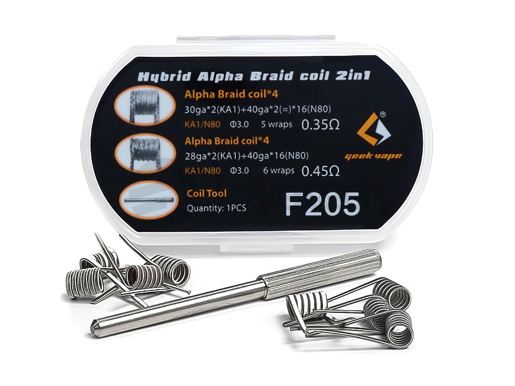 Již hotové, předmotané kanthalové spirálky od výrobce GeekVape, nesoucí označení Hybrid Alpha Braid. V tomto případě jde o unikátně spletené spirálky, které v sobě ukrývají jak kanthalový, tak nichromový odporový drát. V balení naleznete také speciální nástroj se dvěma různými průměry, takže si můžete spirálky jednoduše uzpůsobit.