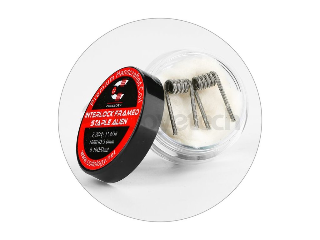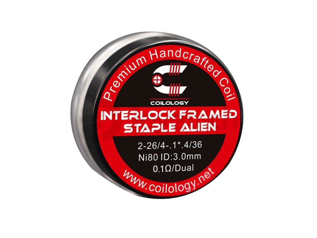 Předmotané spirálky Coilology Interlock Framed Staple Alien Ni80 disponují odporem 0,1 ohm. Jsou vyrobeny z nichromu. Jsou tvořeny čtyřmi plochými odporovými dráty a dvěma kulatými dráty v jádru (2*26GA - 2* 0,4 mm a 4x 0,1 mm), které jsou omotané tenkým nichromovým drátem s průměrem 0,13 mm (36GA). Jsou určené pro