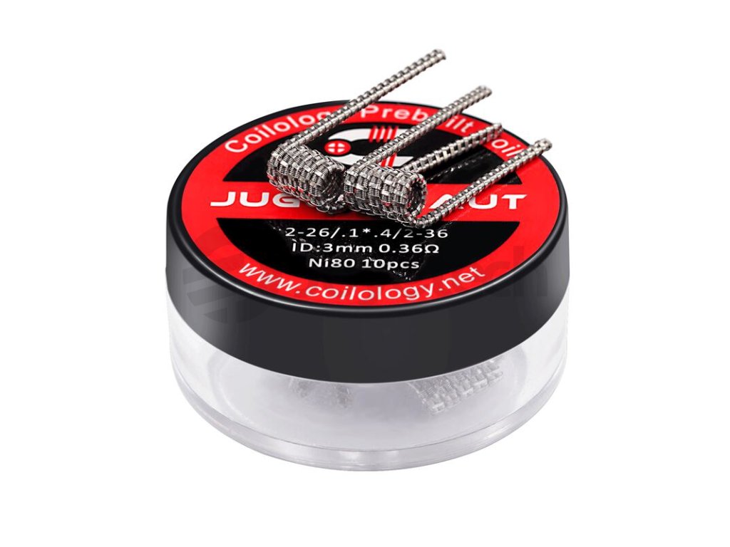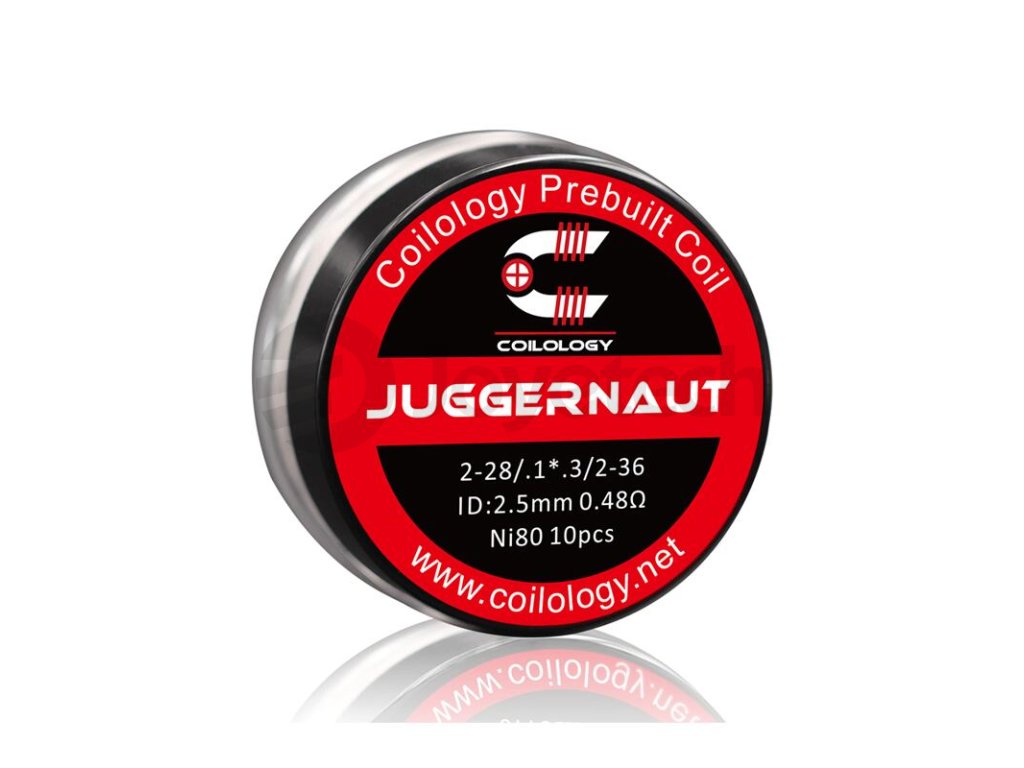 Předmotané spirálky Coilology Juggernaut Ni80 disponují odporem 0,48 ohm. Jsou vyrobeny z nichromu. Spirálky Juggernaut tvoří dva dráty s jádrem 2* 0,3 mm (2* 28GA), tyto dráty jsou omotány dvěma tenkými dráty v konfiguraci 2* 0,13 mm (2* 36GA). Oba tyto clapton dráty jsou k sobě následně připojené a stažené prostřednictvím pevného plochého drátu s rozměry 0,1 * 0,4 mm. Tyto složitější spirálky jsou ideální volbou pro cloudchasing,