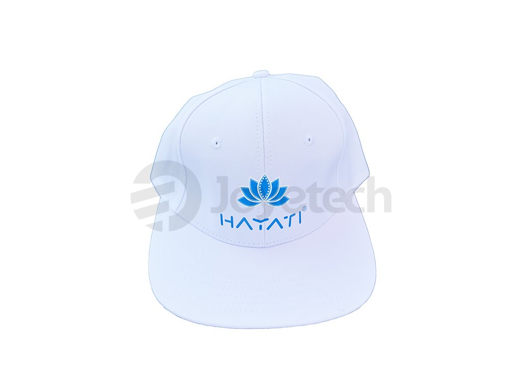 Elegantní bílá kšiltovka značky Hayati v klasickém snapback stylu s rovným kšiltem. Na přední části je aplikováno černé logo Hayati s charakteristickým lotosovým květem, který je symbolem značky.