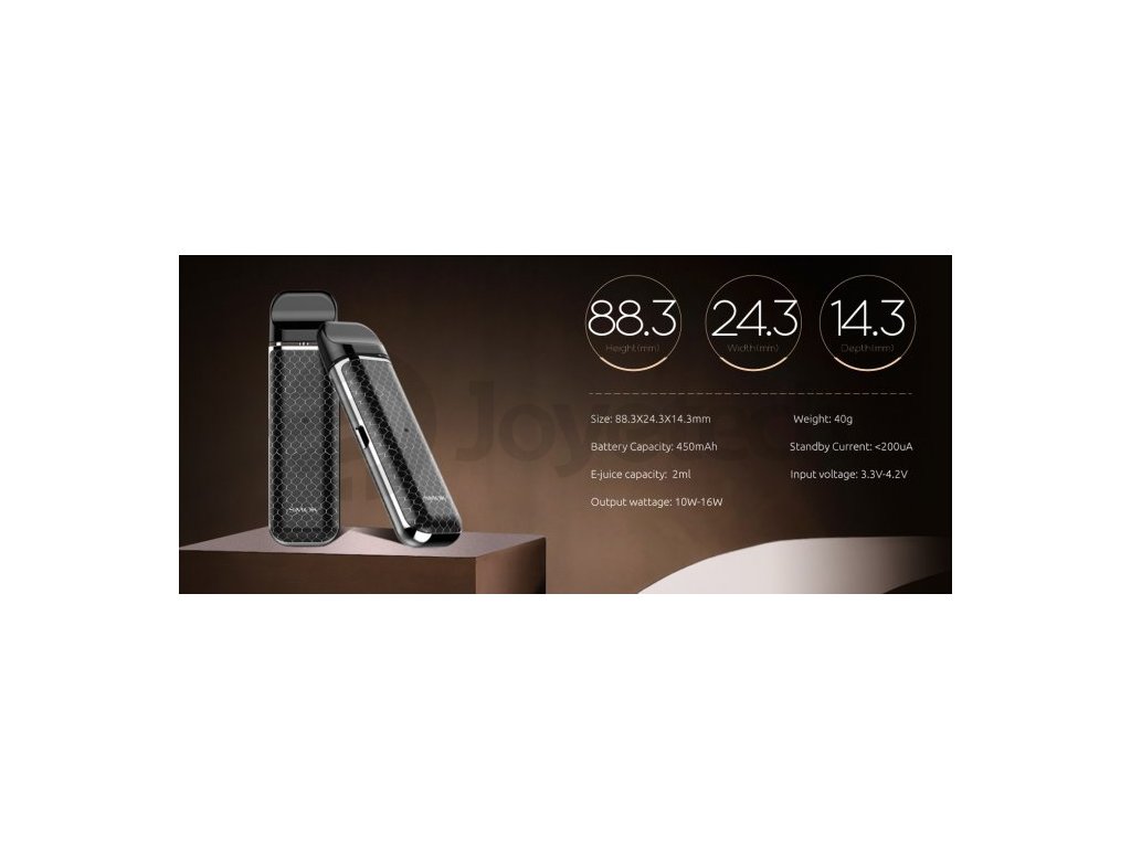 Smoktech představuje novou elektronickou cigaretu s POD systémem a krásným designovým zpracování ve stylu Cobry. Vyměnitelná cartridge (POD) s žhavicí hlavou pojme až 2ml liquidu. Jednoduchým zacvaknutím propojíte cartridge s tělem baterie, které ukrývá vestavěnou baterii o kapacitě 450mAh s automatickým spínačem a LED indikátorem stavu nabití. Nabíjení zajišťuje micro USB vstup. Novo disponuje osmivteřinovou kontrolou potahů, ochranou proti zkratu, přehřátí a vybití. Díky svým proporcím se stane nedílnou součástí Vašich kuřáckých potřeb.