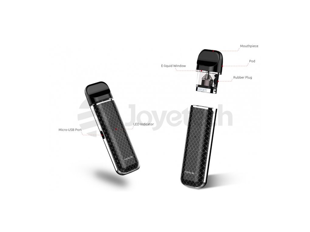 Smoktech představuje novou elektronickou cigaretu s POD systémem a krásným designovým zpracování ve stylu Cobry. Vyměnitelná cartridge (POD) s žhavicí hlavou pojme až 2ml liquidu. Jednoduchým zacvaknutím propojíte cartridge s tělem baterie, které ukrývá vestavěnou baterii o kapacitě 450mAh s automatickým spínačem a LED indikátorem stavu nabití. Nabíjení zajišťuje micro USB vstup. Novo disponuje osmivteřinovou kontrolou potahů, ochranou proti zkratu, přehřátí a vybití. Díky svým proporcím se stane nedílnou součástí Vašich kuřáckých potřeb. Více info v detailním popisu