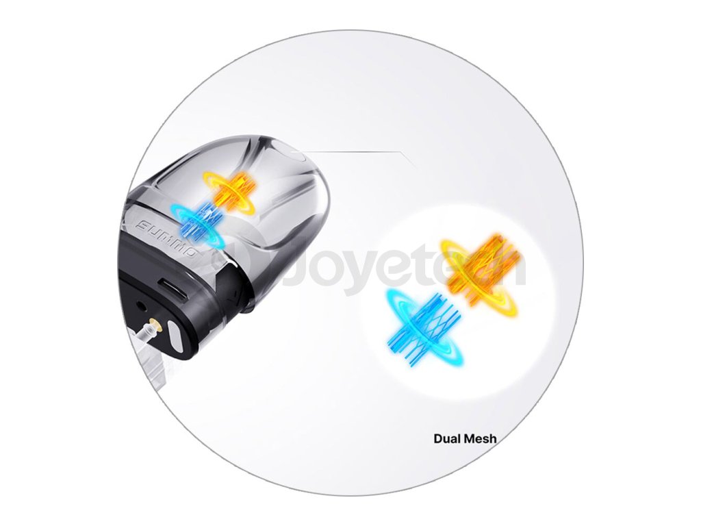 Převratná technologie Dual Mesh umožňuje používání až dvou samostatných mesh pletiv v jádru. Cartridge tohoto modelu je v jádru osazena dvěma samostatnými mesh pletivy, přičemž při nastavení nižšího výkonu je aktivní pouze jedno z nich. Pokud si nastavíte tlačítkem výkon vyšší, automaticky se aktivuje i druhé mesh pletivo a výsledný odpor se vydělí dvěma. Přepnutí do režimu Dual Mesh probíhá zcela automaticky dosažením určité hodnoty výkonu a nastavení celé e-cigarety je nesmírně intuitivní a jednoduché.