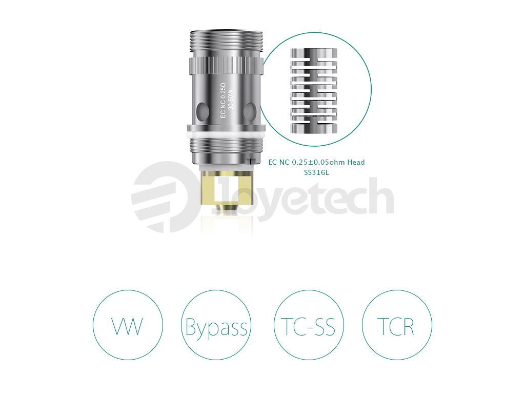 Inovativní typ žhavící spirálky NotchCoil nyní naleznete i v EC žhavících hlavách. S odporem 0,25Ω si ji užijete nejvíce na 30W-60W. NotchCoil není tradiční spirálkou, ale je vyroben z jednoho kusu nerezové trubičky, nabízí tak větší povrch pro odpařování, více páry a lepší podání chuti než klasické spirálky.