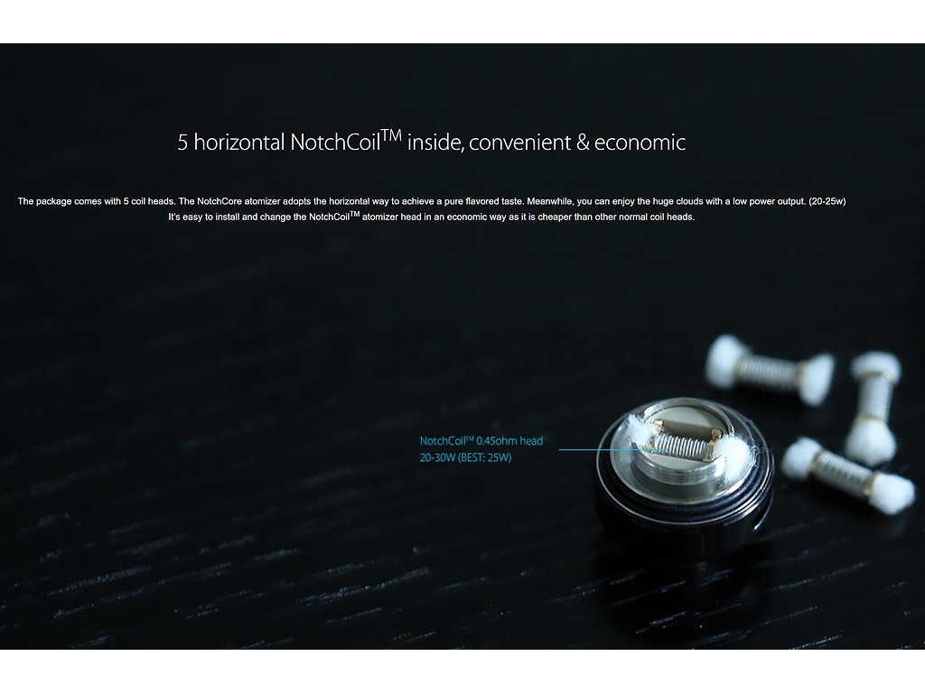 Náhradní žhavící spirálka Joyetech NotchCoil s velkou plochou pro odpařování e-liquidu, určená pro přímé potahování do plic (DL). Kompatibilní s Clearomizéry Joyetech NotchCore aj. Celkový odpor 0,45ohm, doporučený výkon 20-30W.